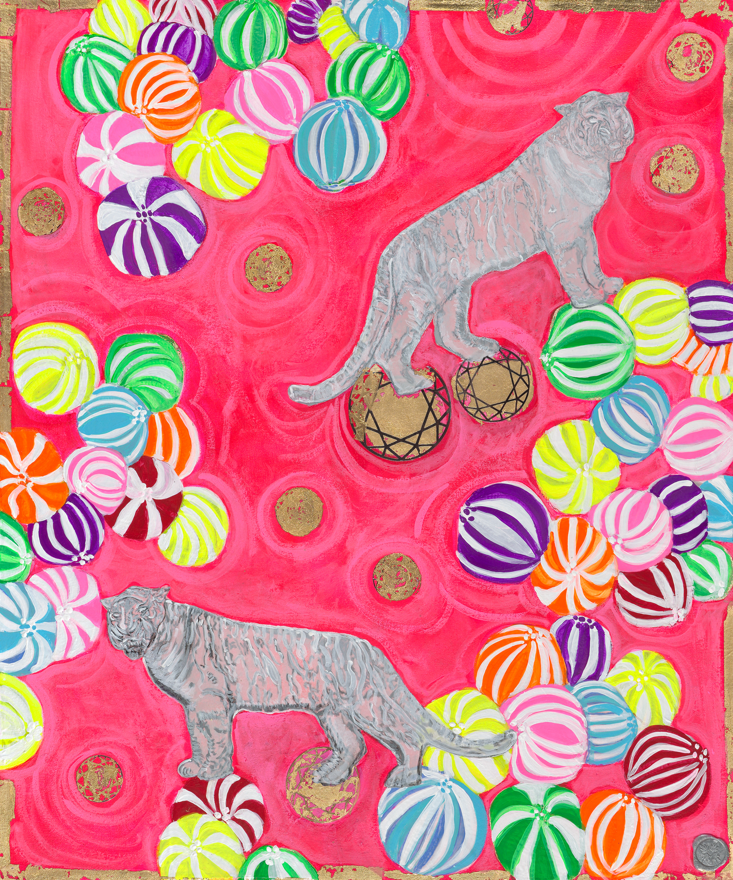 Indulge in the artistry of meticulously hand-cut and painted paper on exquisite gilded canvas.